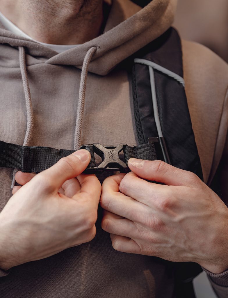 - Fényvisszaverő részletek a hátizsák pántjain cipzáras zsebbel kulcsoknak és apróságoknak