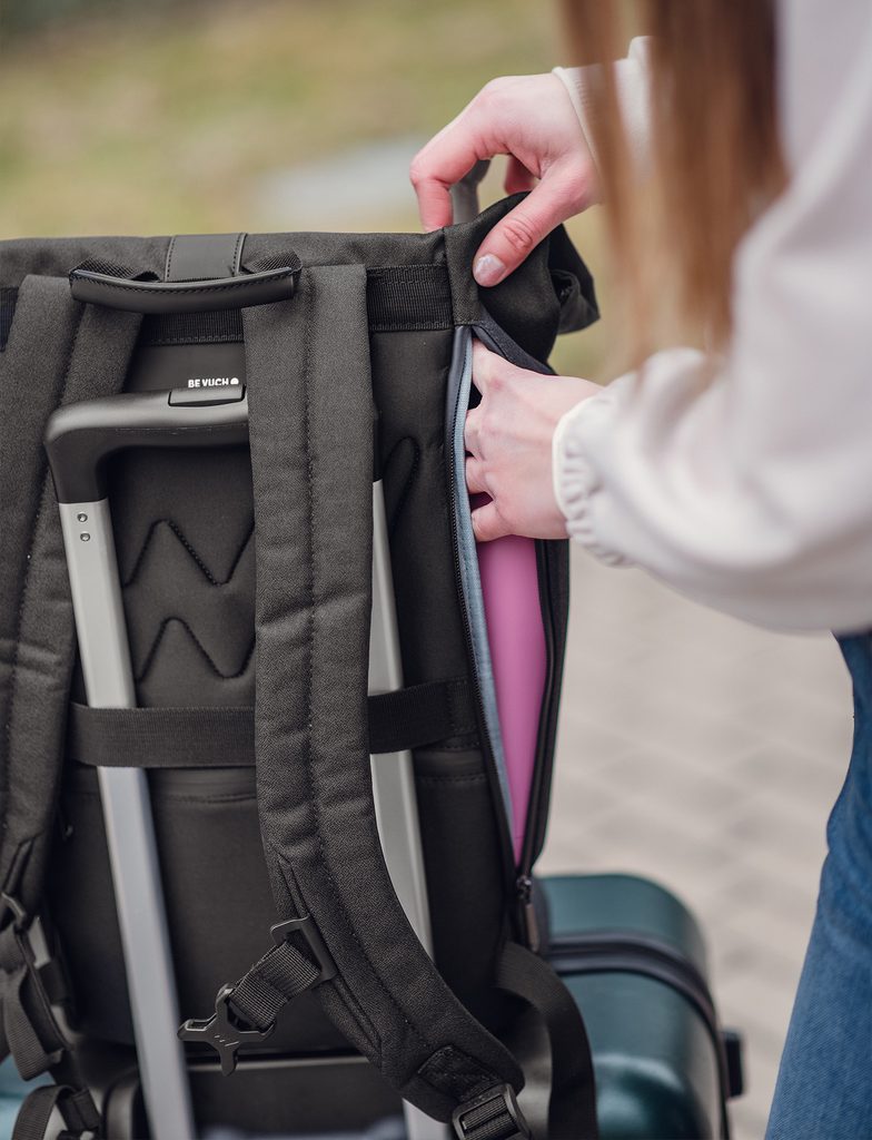 | Tulajdonságok | Párnázott hátlap, Párnázott pántok, Rejtett zseb, Belső cipzáras zseb, Vízálló anyag, Rögzítés a bőröndhöz, Roll-top, Laptopzseb |